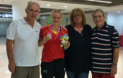 [Trainer Bernhard Wald (links) und Fabiennes Eltern Ilka und Edwin Schönig waren mit der 17-Jährigen in Nanjing und entsprechend stolz auf die Olympia-Zweite.]