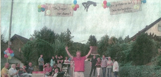 Bei der Rückkehr in die Heimat Anfang der Woche erlebten beide eine schöne Überraschung. „Unsere Nachbarn haben eine Leine über die Straße gespannt auf der „Herzlichen Glückwunsch" stand, freute sich Fabienne Schönig. Nicht weniger bemüht waren die Nachbarn von Tim Jaeger in Dieringhausen, die spontan ein kleines Straßenfest organisiert hatten, unter einem Banner mit der Aufschrift „Tim our champ“. Dieses hängt in 4,90 m Höhe-exakt die Marke, die der siebzehnjährige bei der WM übersprang. „Das war eine tolle Geste und richtig cool“, sagte Tim Jaeger.